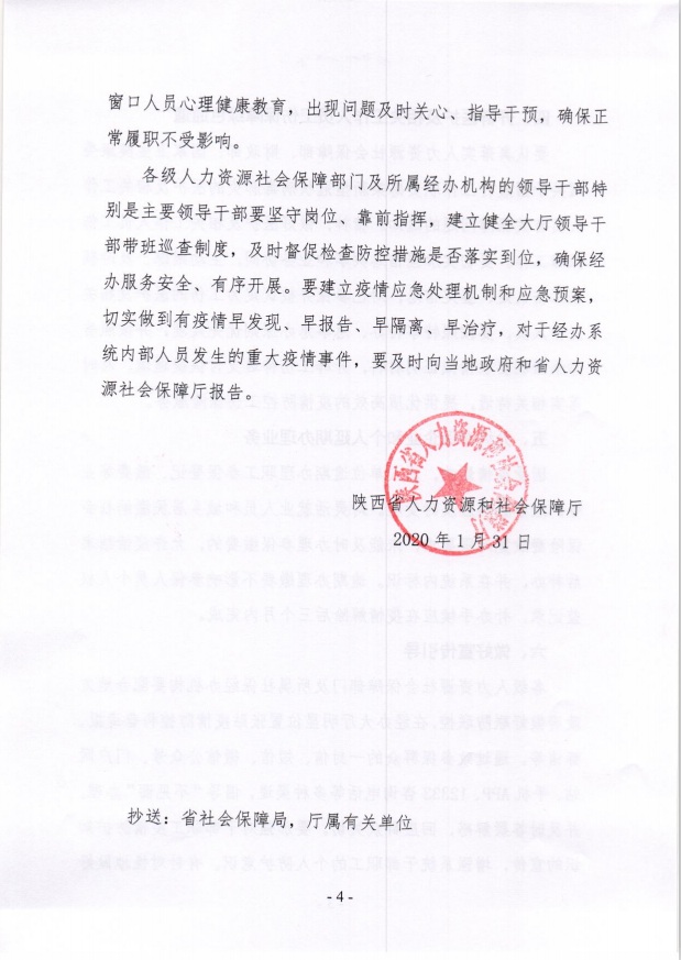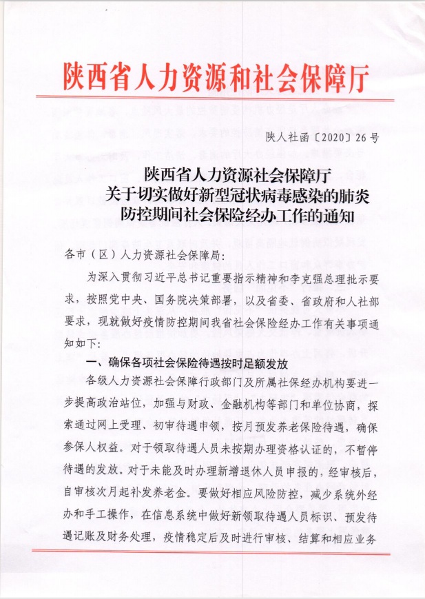 现将陕西省人力资源和社会保障厅《关于切实做好新型冠状病毒感染的肺炎防控期间社会保险经办工作的通知》(陕人社函〔2020〕26号)转发你们,请认真贯彻落实。