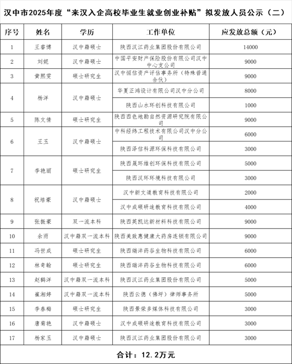 附件:汉中市2025年度“来汉入企高校毕业生就业创业补贴”拟发放人员公示表(二)