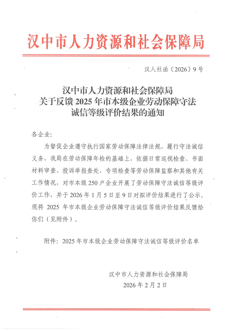汉中市人力资源和社会保障局关于反馈2025年市本级企业劳动保障守法诚信等级评价结果的通知