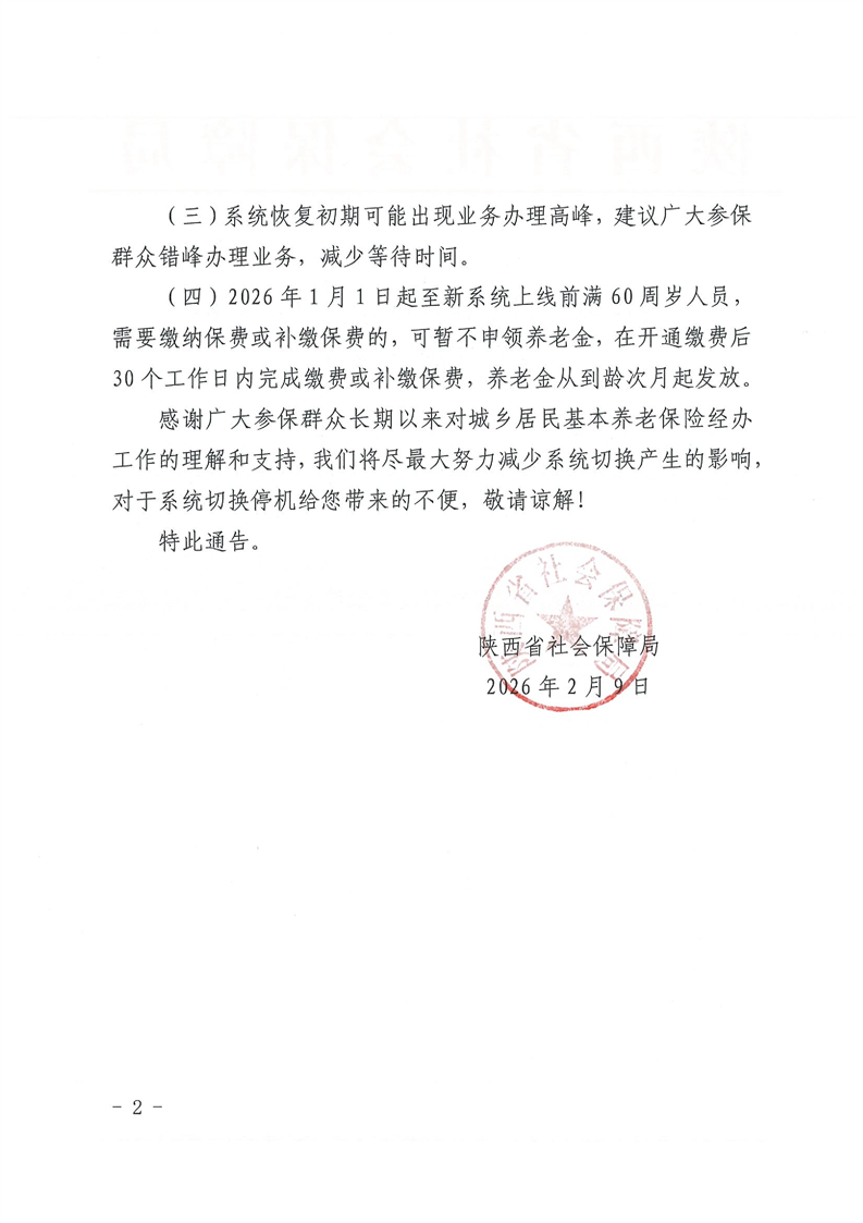 陕西省社会保障局关于陕西省城乡居民养老保险管理信息系统停机切换的通告